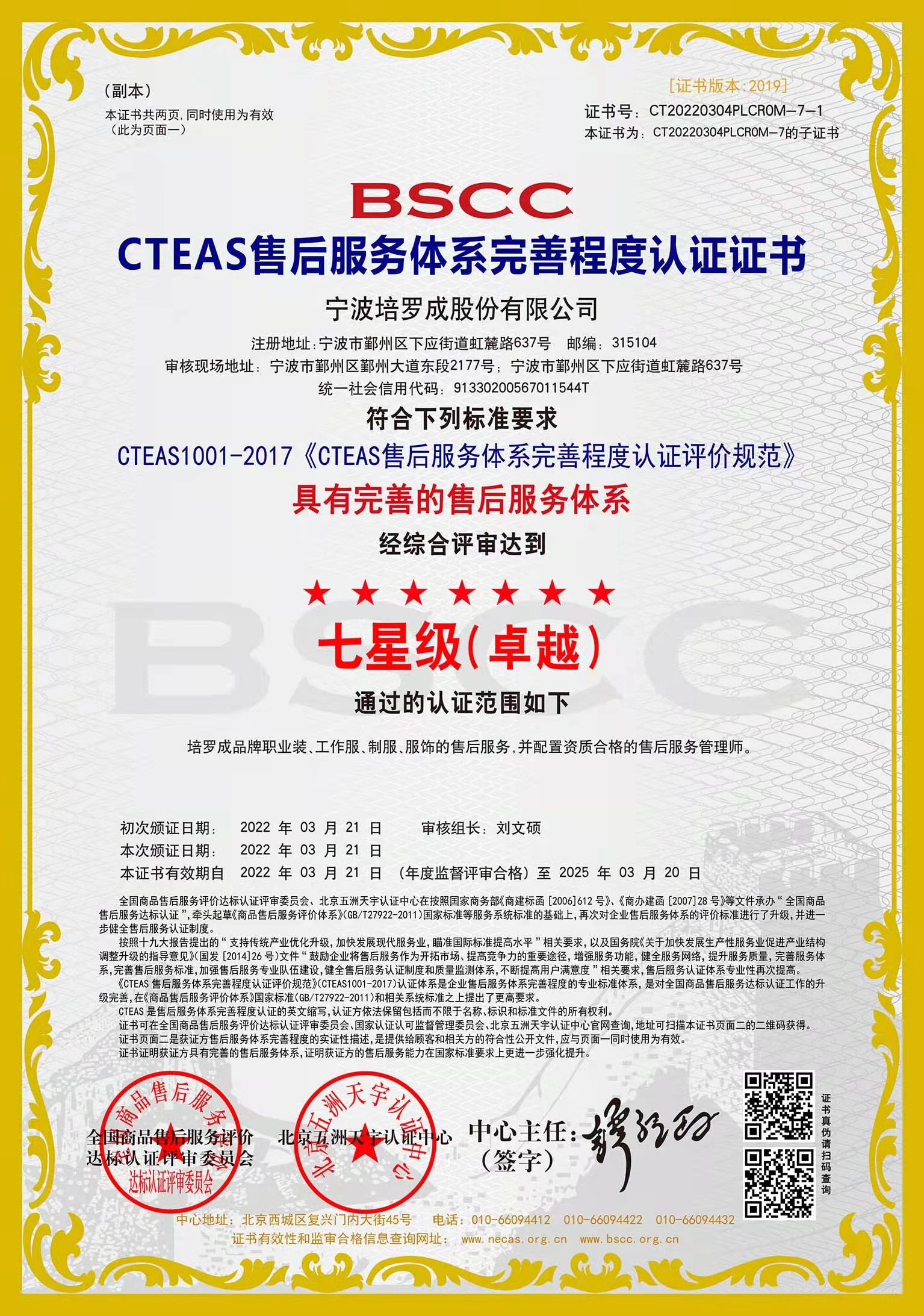 七星級售后服務證書
