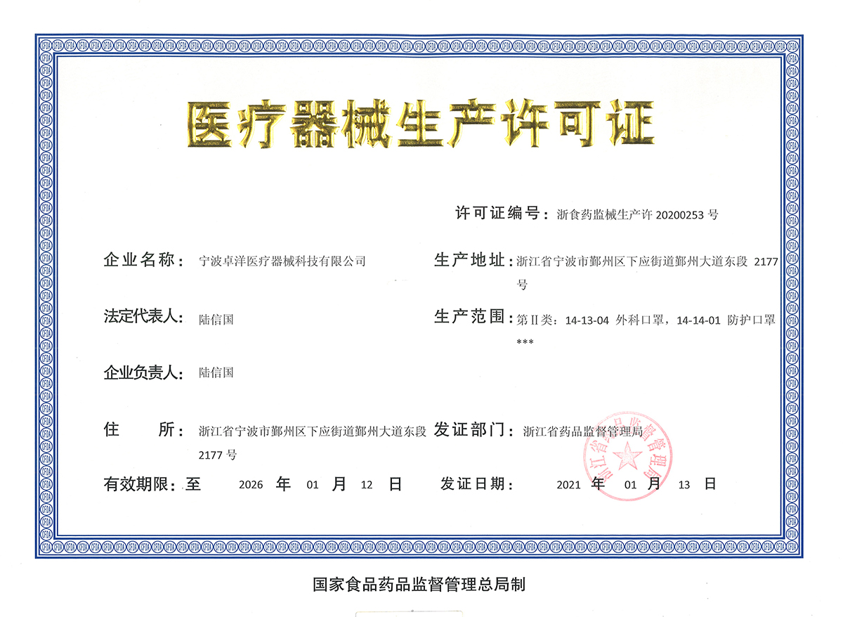 近日,培羅成控股子公司寧波卓洋醫(yī)療器械科技有限公司喜獲由浙江省藥品監(jiān)督管理局核發(fā)的五年《中華人民共和國醫(yī)療器械注冊證》和《醫(yī)療器械生產許可證》,生產范圍為“Ⅱ類:14-13-04外科口罩,14-14-01防護口罩”。